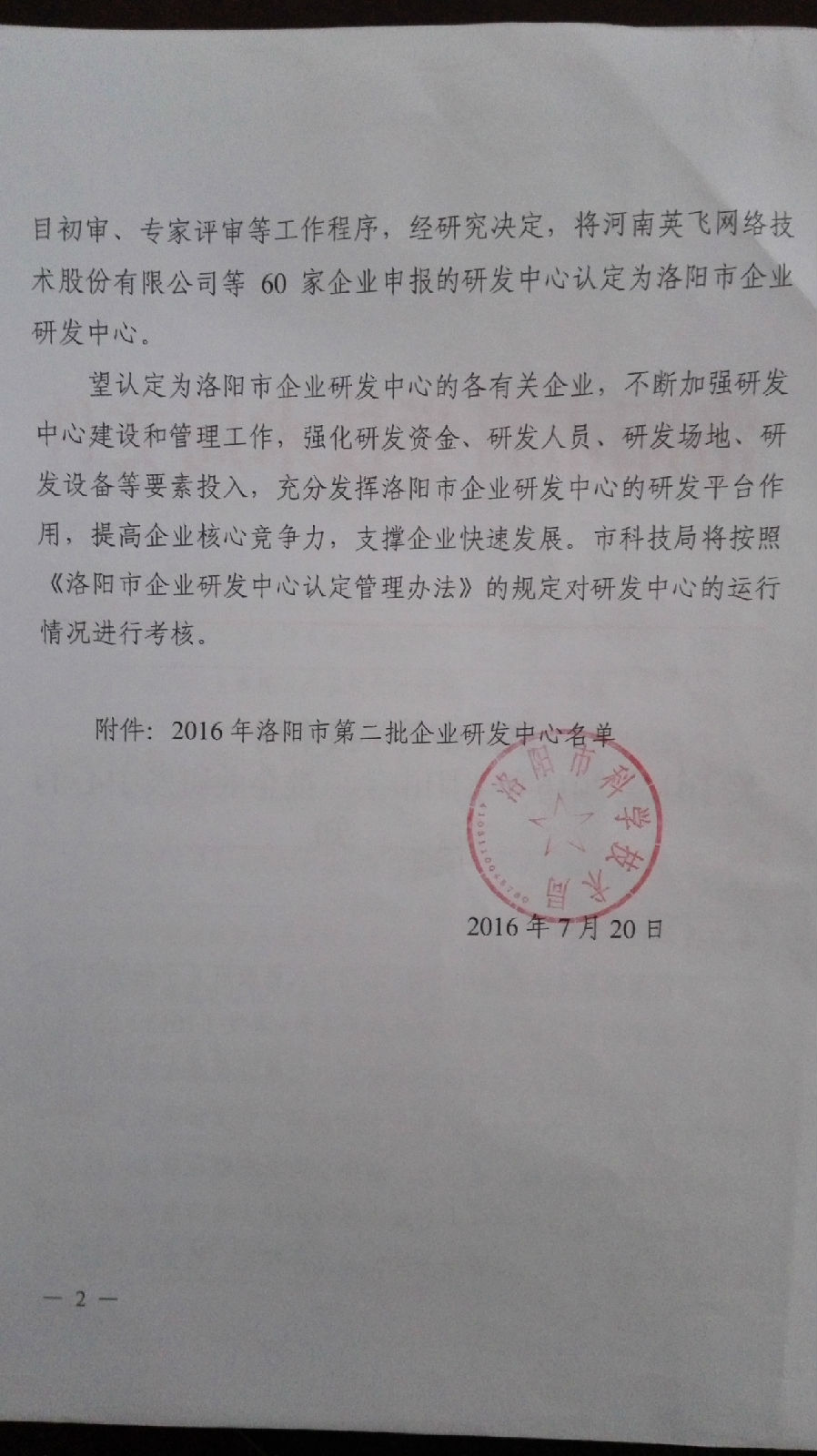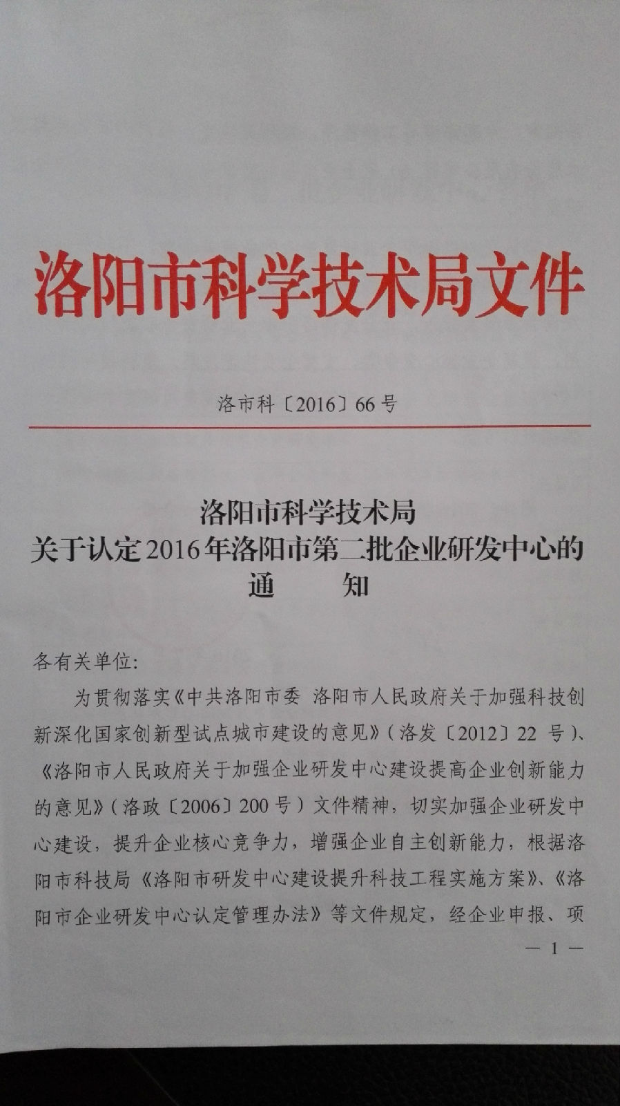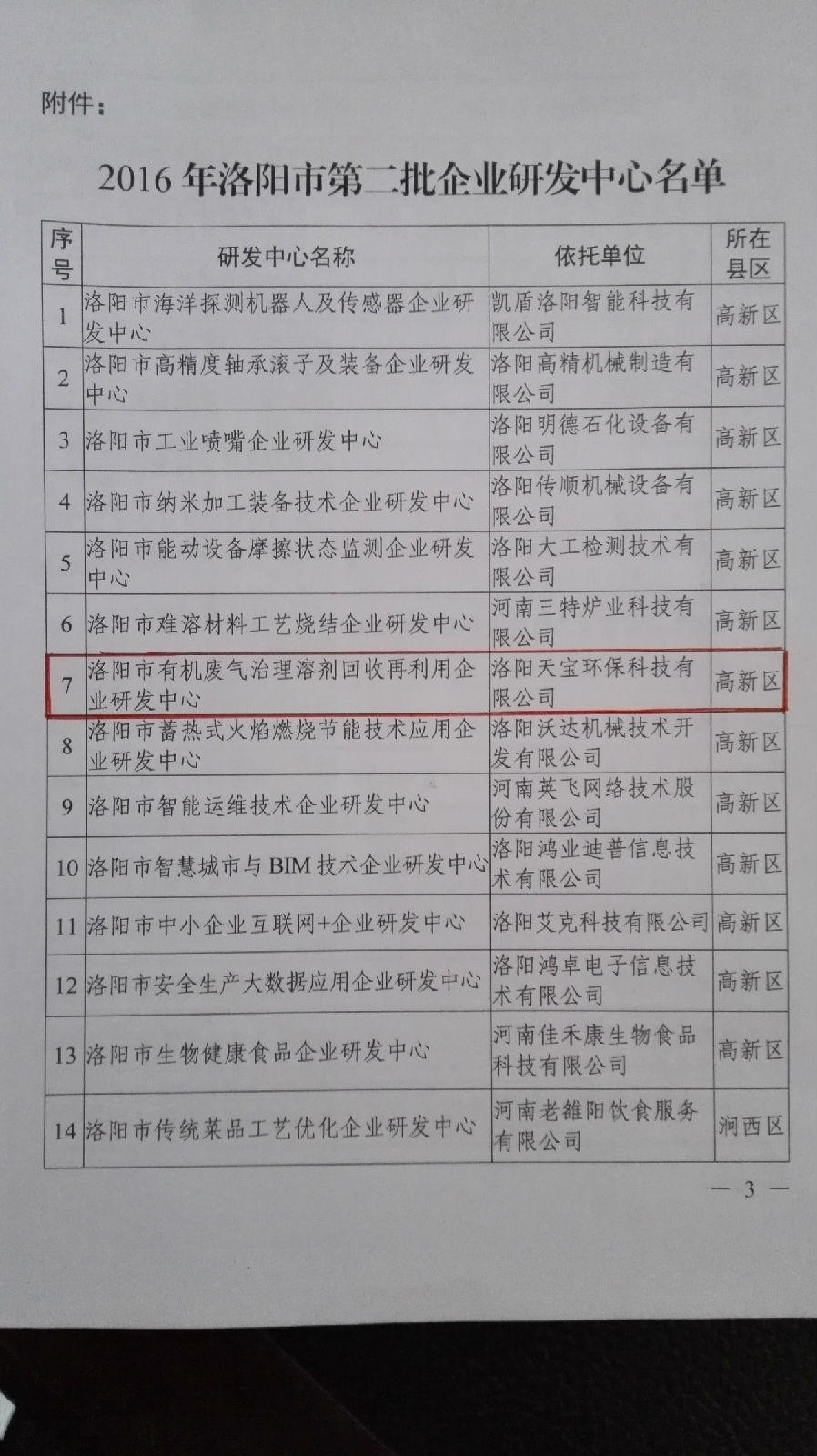 2016年8月, 公司設(shè)立的“洛陽市有機(jī)廢氣治理溶劑回收再利用企業(yè)研發(fā)中心”獲得洛陽市科技局認(rèn)定。(《洛陽市科技局關(guān)于認(rèn)定2016年洛陽市第二批企業(yè)研發(fā)中心的通知》洛市科【201666號文件)