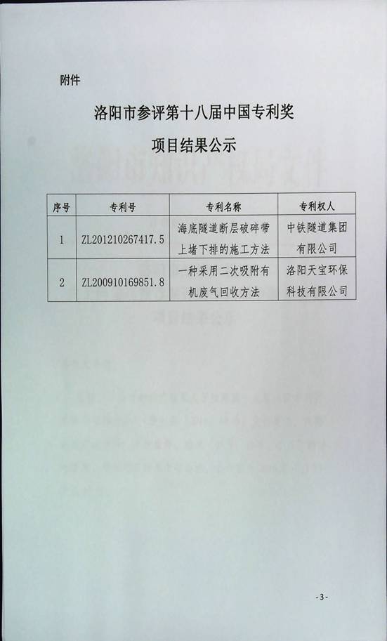 公司***“一種采用二次吸附有機廢氣回收方法”(***號:ZL 2009 1 0169851.8)被高新區(qū)和洛陽市推薦參加中國第十八屆***獎的評選。
